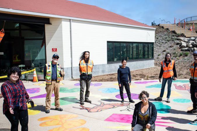El proyecto también incluye “piezas abstractas, la simbología y los motivos que se sienten orgánicos, como parte de la naturaleza”, dijo Roberto Martínez, quien es un curador del Centro de Arte de la ciudad de Richmond y fue uno de los voluntarios ayudantes en la instalación artística. Junto con extender una invitación a la comunidad latina, Martínez dijo que el proyecto tiene que ver con la historia natural y la historia de los pueblos originarios. “Este es un lugar muy histórico y el arte nos ayuda a conectarnos… Son historias que tenemos en común, que nos conectan con el lugar” dijo.