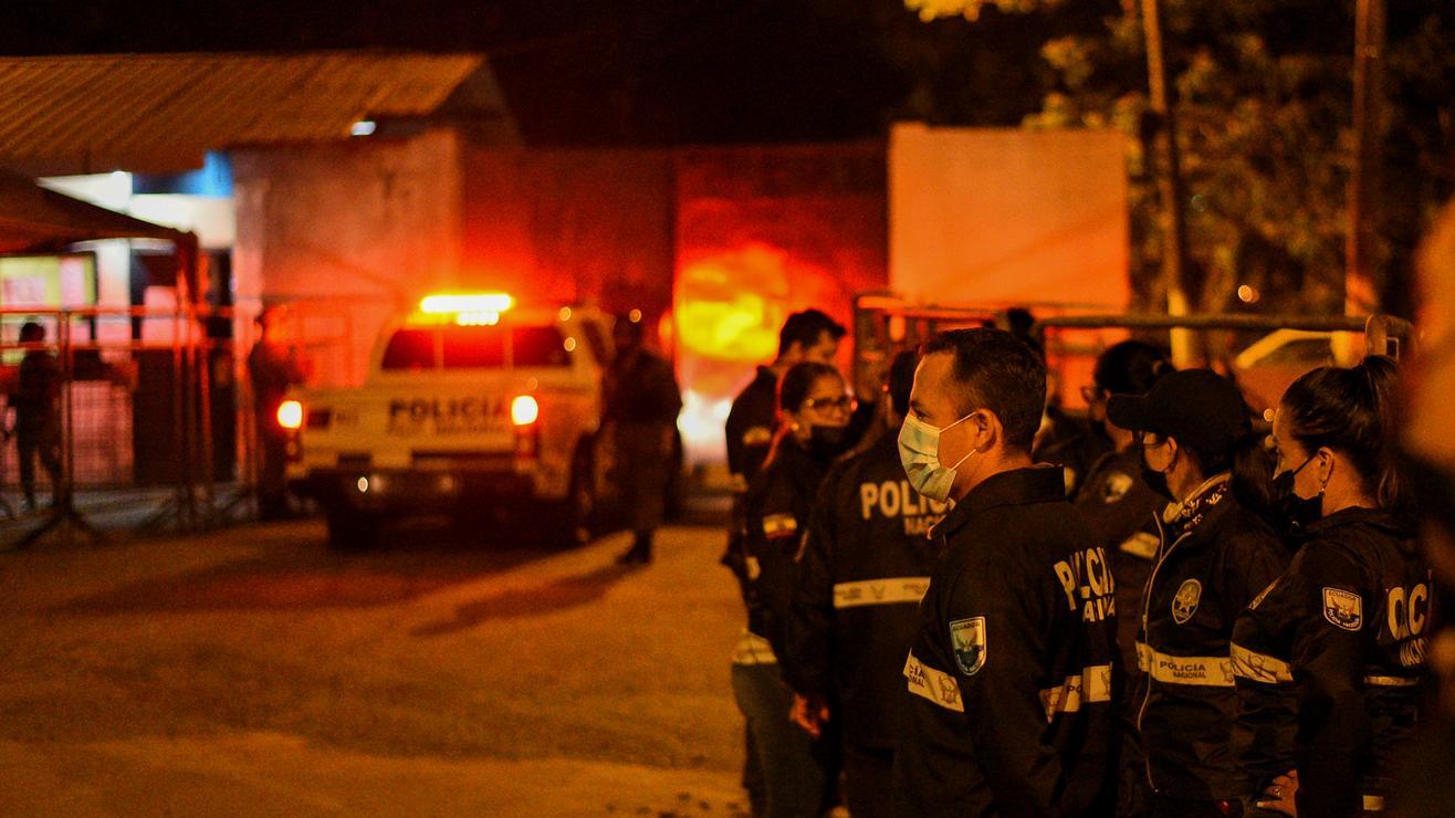 En la gráfica aparecen también policías de Ecuador y Perú, junto a una gran pancarta que reza: “Policía Nacional del Perú, dirección nacional de investigación criminal, Dirección contra la trata de personas y tráfico ilícito de migrantes”.