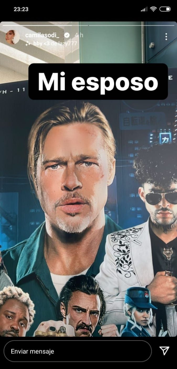 Camila usó sus stories de la red social hacia su colega, el actor Brad Pitt. Ella compartió una foto del afiche promocional de la película ‘Bullet Train’ protagonizada por el el aclamado y codiciado actor y escribió sin filtros “Mi esposo” declarando de este modo la inmensa admiración ¿y amor? que tiene hacia él.