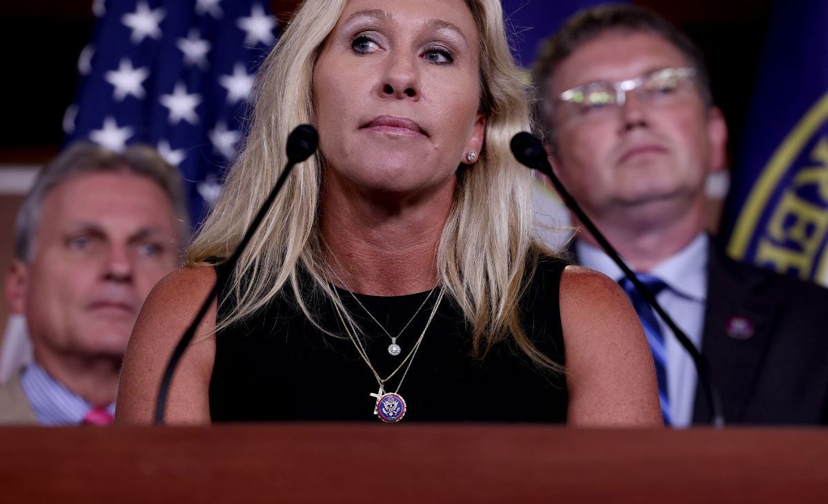 Marjorie Taylor Greene habla en una conferencia de prensa sobre la "Ley de incendios Fauci" Crédito: Anna Moneymaker | Getty Images