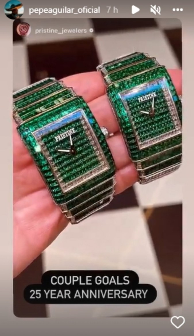 En esta ocasión el cantante de regional mexicano subió a su cuenta oficial en Instagram un video de la joyería en la que están preparado dos relojes con brillantes y piedras verdes totalmente iguales, uno para ella y otro para él.