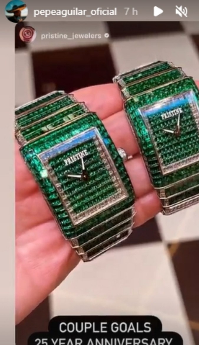 En esta ocasión el cantante de regional mexicano subió a su cuenta oficial en Instagram un video de la joyería en la que están preparado dos relojes con brillantes y piedras verdes totalmente iguales, uno para ella y otro para él.