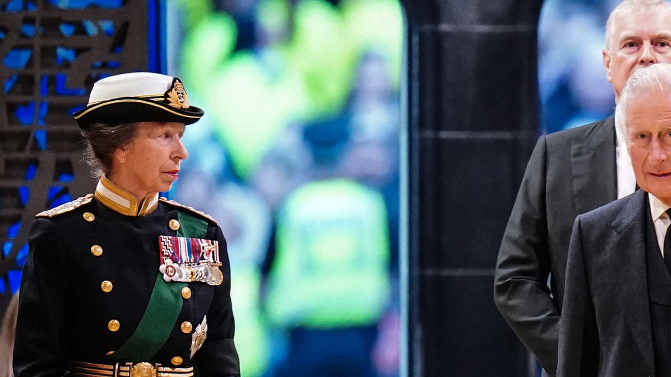 Los cuatro hijos de la reina, el rey Carlos III, la princesa Ana, Andrés, duque de York, y Eduardo, conde de Wessex, acompañaron a pie el traslado del féretro desde el palacio de Holyroodhouse hasta la catedral de St. Giles. Junto a ellos caminaba el marido de Ana, el vicealmirante Tim Lawrence.