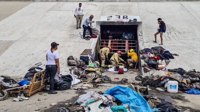 Un equipo de bomberos rescatistas de Tijuana tuvo que desalojar primero toda la entrada a la compuerta, cerca de una tonelada de basura, para luego forzar la entrada y liberar a la mujer.