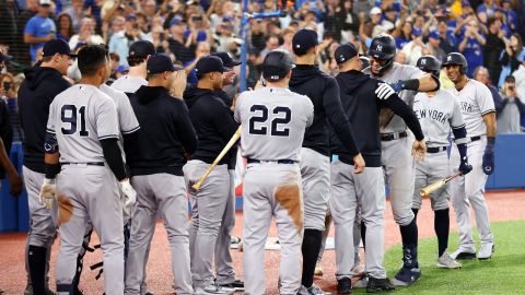 Aaron Judge celebra junto a sus compañeros su cuadrangular 61. Crédito: Vaughn Ridley | Getty Images