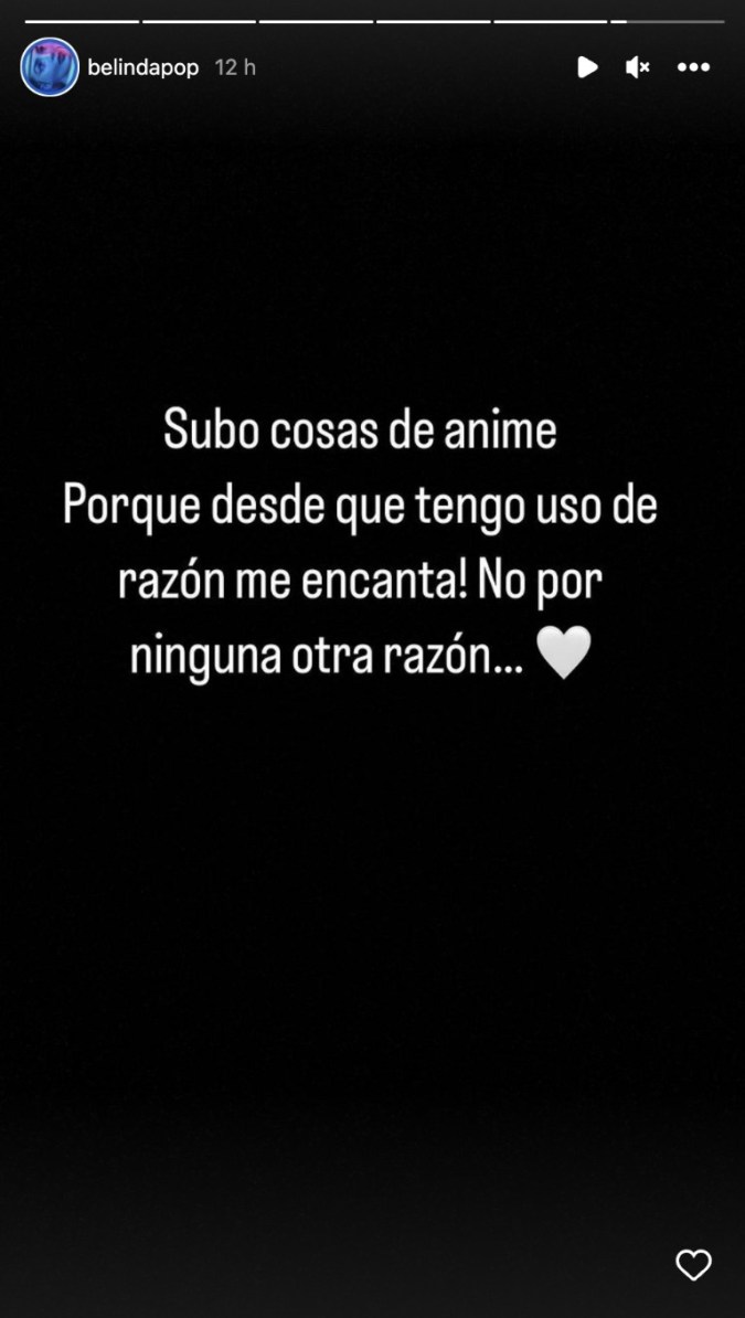 Finalmente, luego de las imágenes de caricaturas de origen japonés, Belinda escribió en una historia de fondo color negro y con letras blancas la confirmación sobre su soltería, pues la rubia aseguró que sus publicaciones anteriores no tienen nada que ver con su estado sentimental.