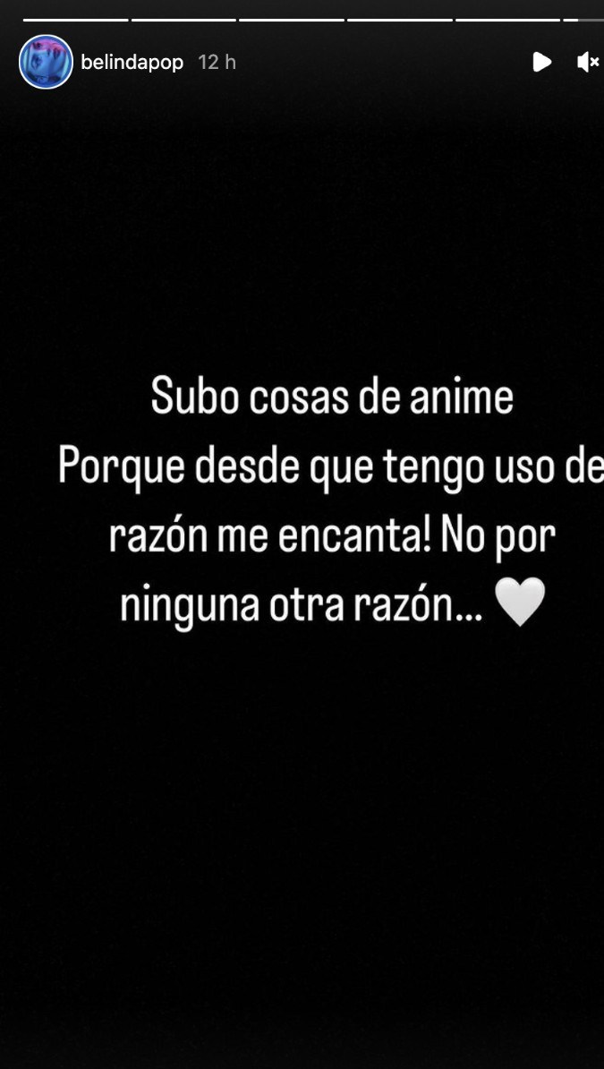 Finalmente, luego de las imágenes de caricaturas de origen japonés, Belinda escribió en una historia de fondo color negro y con letras blancas la confirmación sobre su soltería, pues la rubia aseguró que sus publicaciones anteriores no tienen nada que ver con su estado sentimental.
