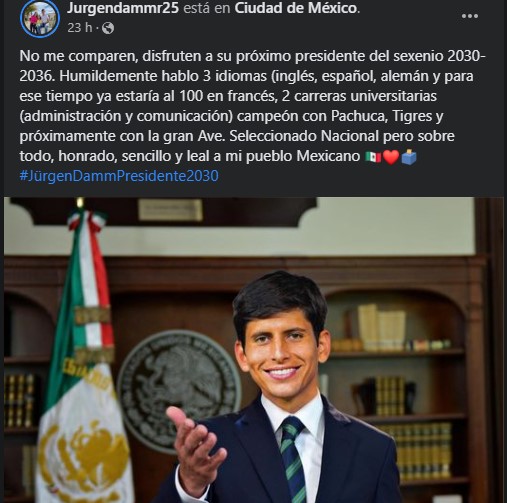 “No me comparen, disfruten a su próximo presidente del sexenio 2030-2036. Humildemente hablo 3 idiomas (inglés, español, alemán y para ese tiempo ya estaría al 100 en francés, 2 carreras universitarias (administración y comunicación) campeón con Pachuca, Tigres y próximamente con la gran Ave. Seleccionado Nacional pero sobre todo, honrado, sencillo y leal a mi pueblo Mexicano”, escribió el mexicano en redes sociales.