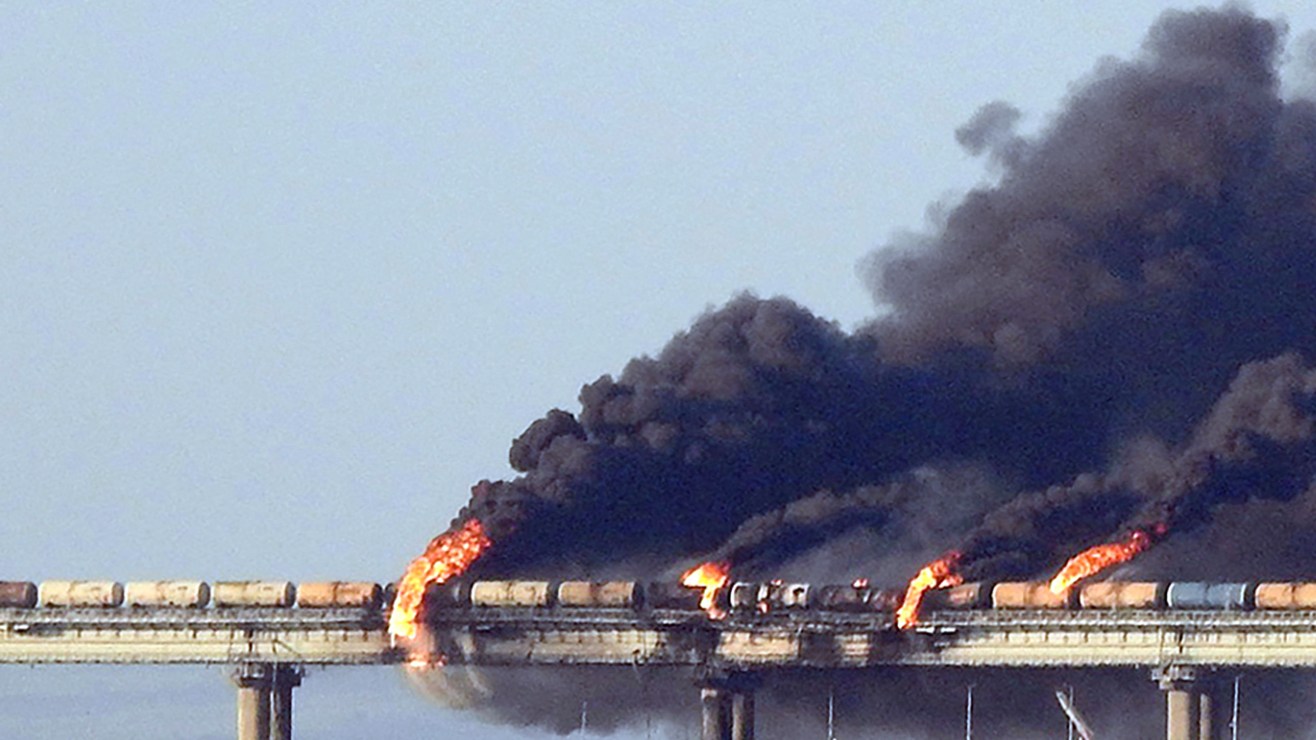 Un camión bomba estalló y provocó que siete vagones cisterna de combustible se incendiaran sobre el estratégico puente que une a Rusia con la península de Crimea y destruyó dos de sus secciones