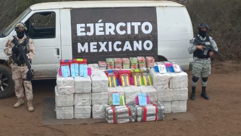 El Ejército Mexicano y Guardia Nacional aseguraron un cargamento de metanfetamina, pastillas de fentanilo, cocaína, así como un vehículo en Ensenada, Baja California.