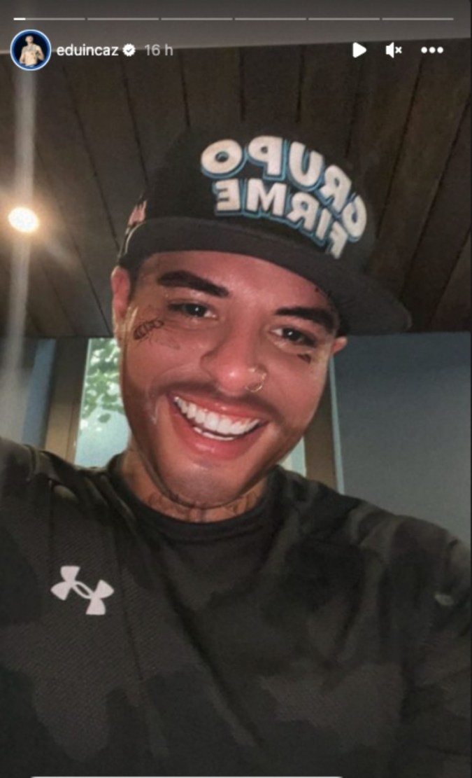 Y aunque el filtro que utilizó Eduin Caz en sus historias de Instagram no es el mismo que uso Poncho De Nigris el cual hacía referencia Nodal, el que usa el líder de Grupo Firme también asemeja como si tuviera muchísimos tatuajes y en el rostro cuello, además que también se ve como su tuviera barba de candado.
