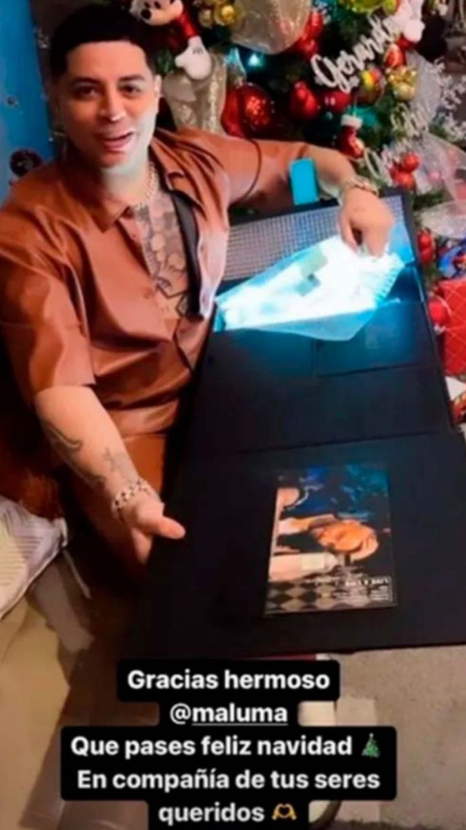 En las redes sociales, el cantante de Grupo Firme escribió: “Gracias hermoso Maluma. Que pases feliz navidad en compañía de tus seres queridos”. Cuando uno ve la imagen, se lo puede ver a Caz junto a una caja con la foto del cantante de dónde sacó la botella de su propia marca de mezcal “Contraluz”.