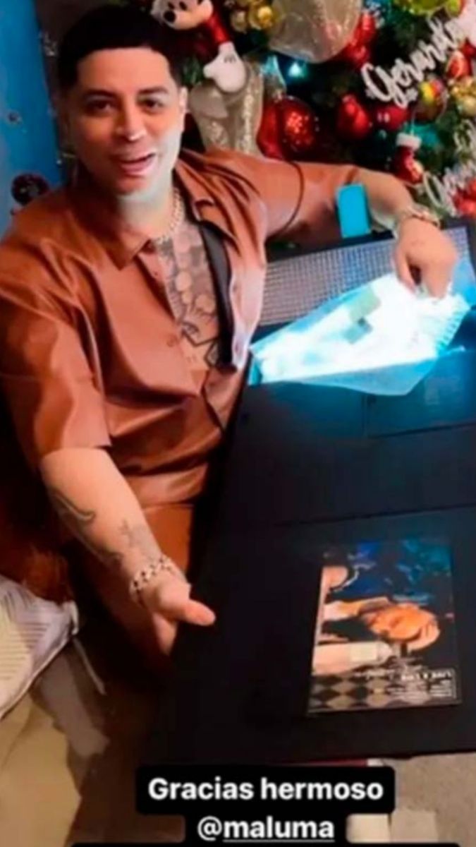 En las redes sociales, el cantante de Grupo Firme escribió: “Gracias hermoso Maluma. Que pases feliz navidad en compañía de tus seres queridos”. Cuando uno ve la imagen, se lo puede ver a Caz junto a una caja con la foto del cantante de dónde sacó la botella de su propia marca de mezcal “Contraluz”.