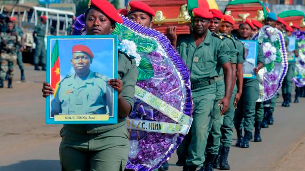 Las viudas lloran frente a las largas filas de ataúdes envueltos en la bandera de Camerún, antes de que los soldados sean enterrados en medio de la pompa y la ceremonia que marcan los funerales militares.
