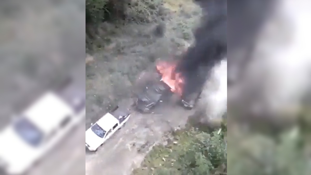 En las imágenes se pueden ver y escuchar las ráfagas de disparos que lanza uno de los militares. Además, se aprecian varias camionetas que fueron blanco de este ataque y que quedaron en llamas.