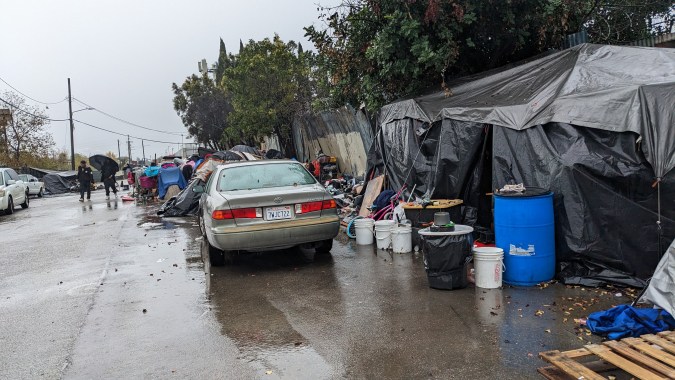Ese mismo martes bajo la fuerte lluvia en el área de Harbor City, al sur de Los Angeles, Manuel, de 68 años, se resguardaba en su pequeña vivienda provisional hecha de lonas y tubos. No era el único.