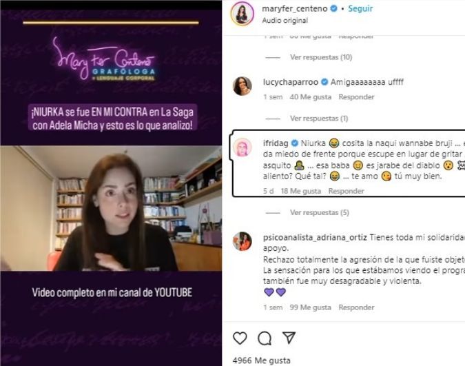 La grafóloga recibió cientos de comentarios por parte de sus admiradores y diferentes celebridades, pero el que más ha destacado es el de Frida Sofía, quien despotricó contra la cantante y actriz.