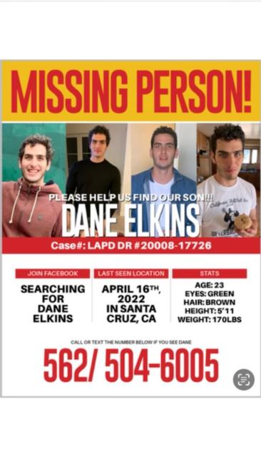 Cualquier información sobre el paradero de Dane Elkins, llamar al 562-504-6005