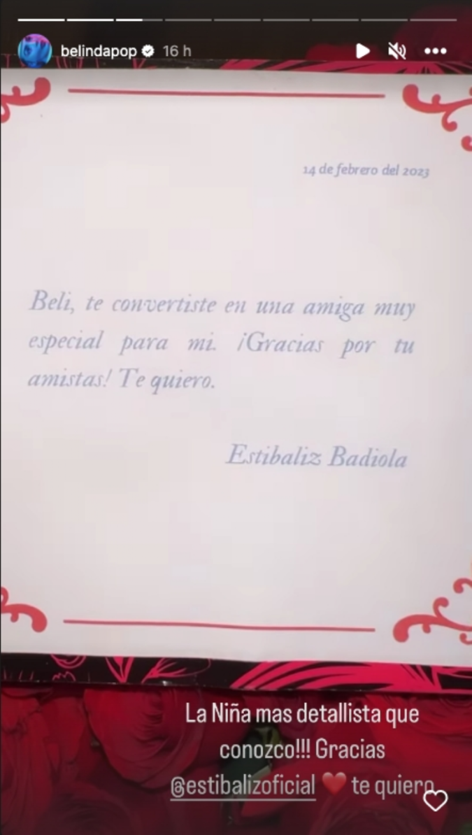 “Beli, te convertiste en una amiga muy especial para mí. ¡Gracias por tu amistad! Te quiero”, se lee en la tarjeta enviada por Estibaliz a Belinda en dicho ramo de rosas rojas.