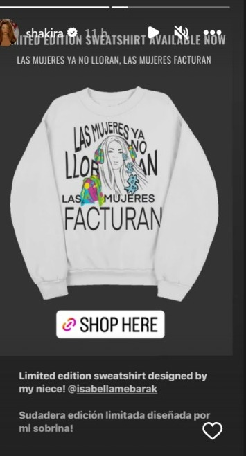 “Sudadera edición limitada diseñada por mi sobrina Isabella mebarak”, se puede leer en la publicación que Shakira compartió en las historias de su cuenta oficial de Instagram.