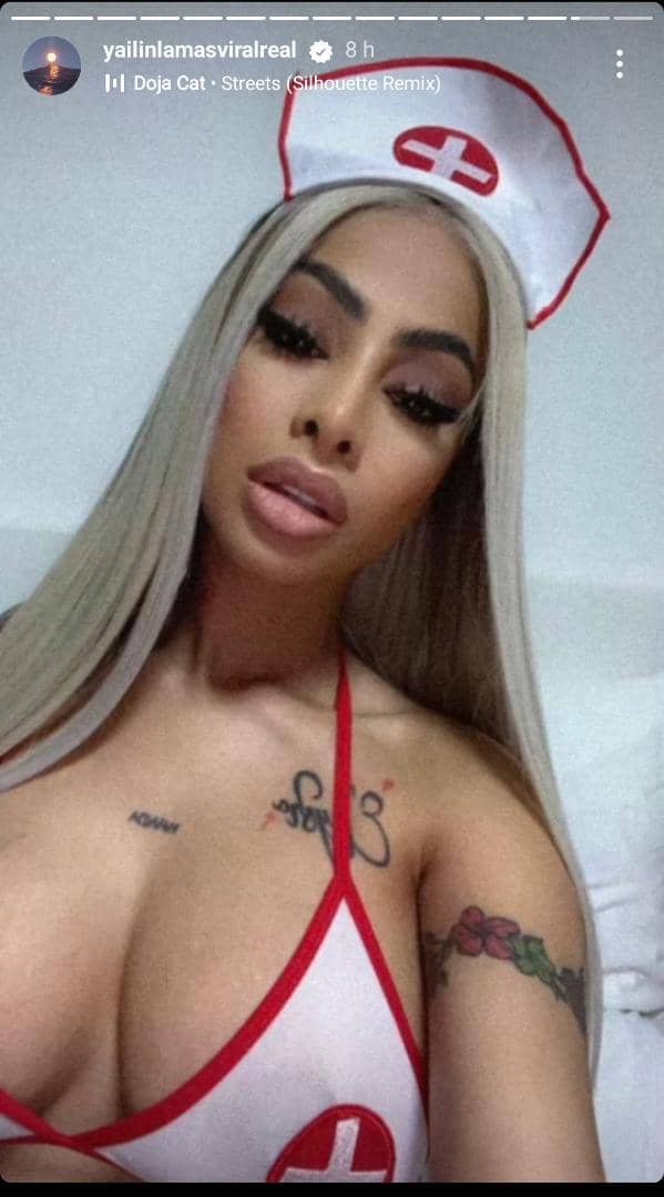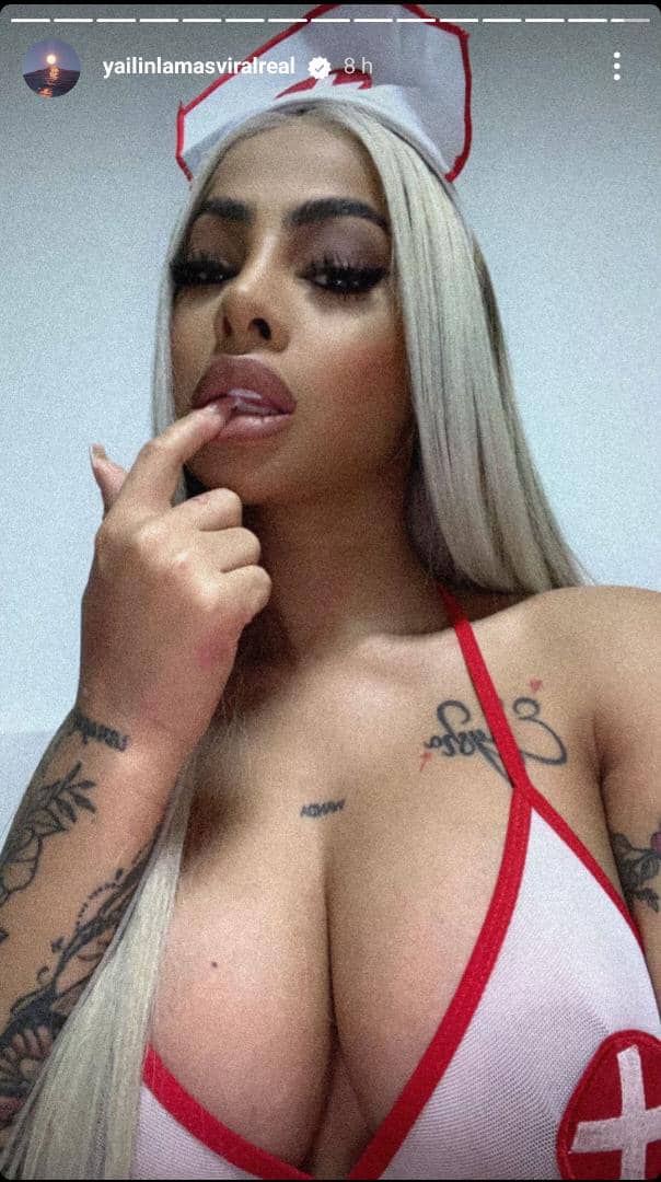 En esta ocasión en sus historias en Instagram para colgó dos fotografías tipo selfies vistiendo un sensual atuendo de enfermera. Apareció vestida con un top de triángulos color blanco y unas cruces rojas en el centro; además de un tocado en el cabello con los mismos colores.