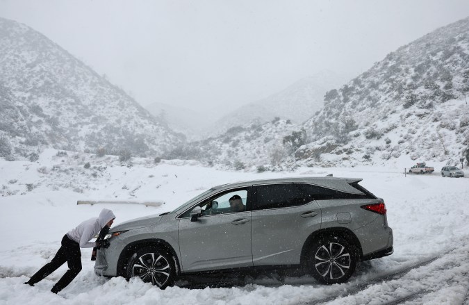 Autoóvil atascado en la nieve en La Canada Flintridge, a pocas millas del Rose Bowl de Pasadena. (Photo by Mario Tama/Getty Images).