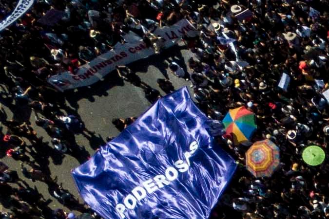 Vista aérea que muestra la marcha en el Día Internacional de la Mujer en Santiago, el 8 de marzo de 2020. – Personas de todo el mundo están tomando medidas para conmemorar el Día Internacional de la Mujer e impulsar acciones para obtener la igualdad. (JAVIER TORRES/AFP via Getty Images)