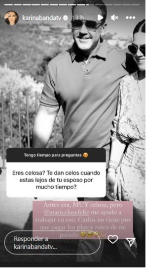 Dicho tema salió a relucir mientras Karina Banda hacía una dinámica de preguntas y respuestas en Instagram. “¿Eres celosa? ¿Te dan celos cuando estás lejos de tu esposo por mucho tiempo?”, cuestionó un fanático.