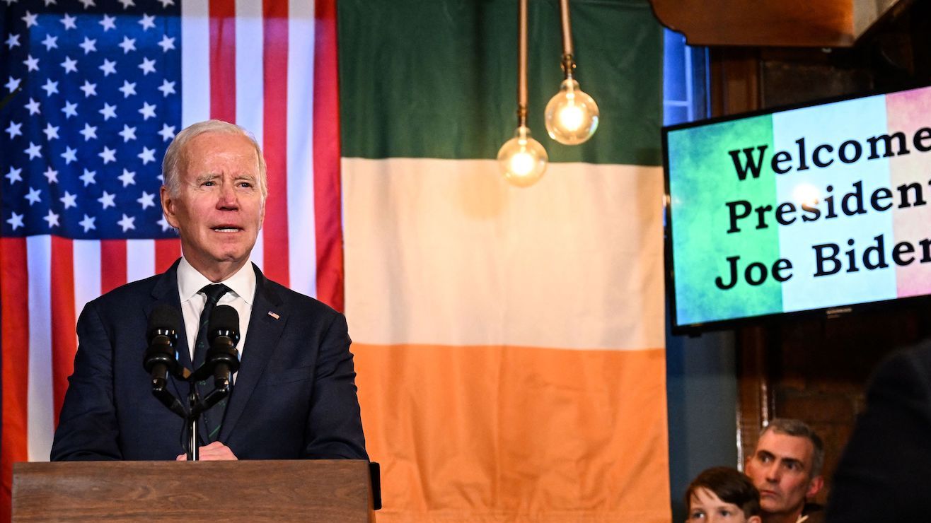 El presidente estadounidense Joe Biden pronuncia un discurso en el Windsor Bar de Dundalk, el 12 de abril de 2023, en el marco de un viaje de cuatro días a Irlanda del Norte e Irlanda. / Foto: AFP/Getty Images Crédito: IM WATSON | AFP / Getty Images