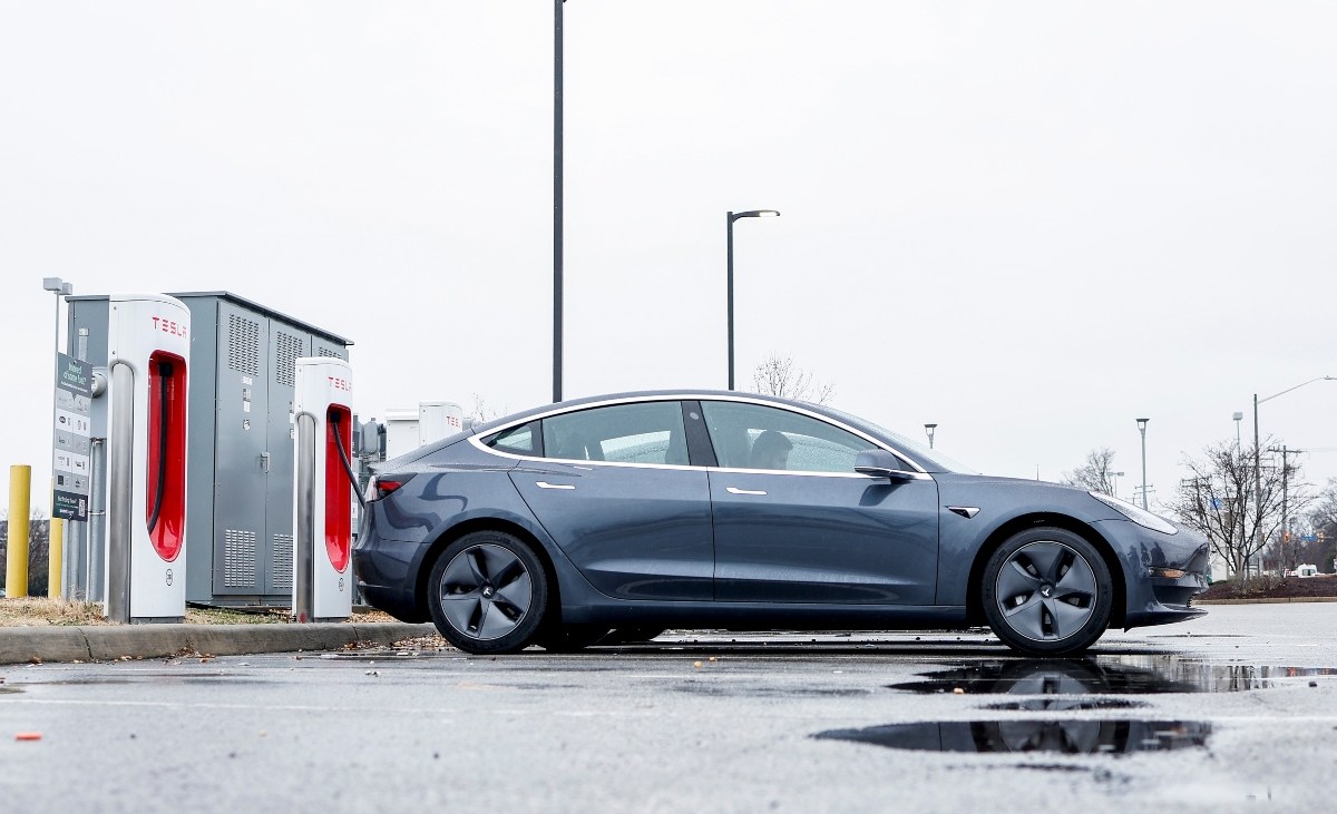 Imagen de una estación de carga para vehículos eléctricos y de un automóvil de la marca Tesla, de color gris.