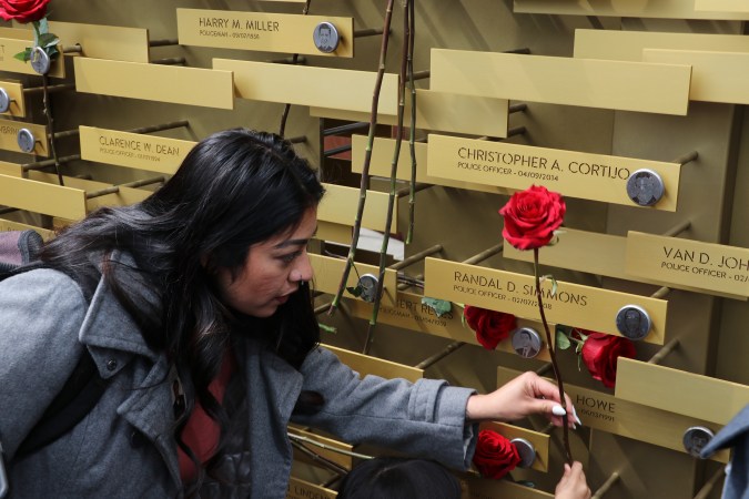 Anahí y su madre, Rocío Díaz, inmigrante de Durango, México, depositaron rosas rojas en el mural conmemorativo a los 239 policías fallecidos en el cumplimiento de su deber.