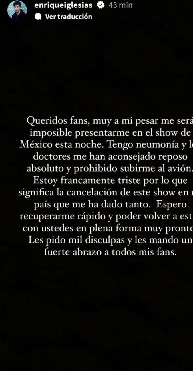 “Como lamentablemente dio a conocer Enrique Iglesias en sus redes sociales, a pesar de todos los esfuerzos realizados, por estricta indicación médica no podrá salir al escenario del Tecate Emblema debido a que presenta un cuadro de neumonía. De ahí que tanto Enrique como quienes organizamos el festival confiamos en la comprensión de los fans ante esta inesperada situación”