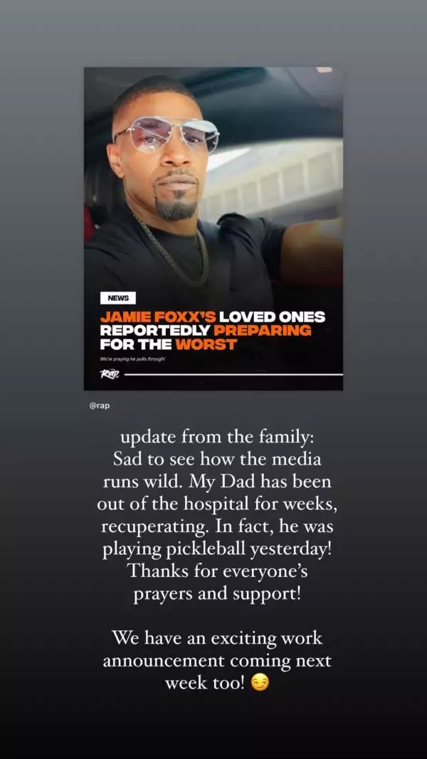 El actor Jamie Foxx habría sido dado de alta del hospital desde hace ya varias semanas, así lo informó su hija Corinne, a través de las historias de Instagram, además agregó que su papá se está recuperando con normalidad.