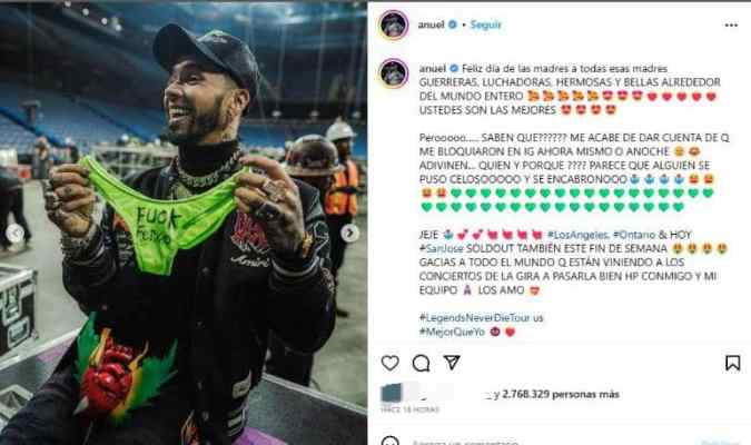 En esta oportunidad, el intérprete de ‘Más Rica que Ayer’ compartió una galería de fotos y un video sosteniendo una tanga verde con insultos contra el cantante Feid. La pieza de ropa íntima podría ser algún regalo de uno de los fanáticos de Anuel AA y él lo mostró en pleno concierto.
