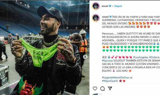 En esta oportunidad, el intérprete de ‘Más Rica que Ayer’ compartió una galería de fotos y un video sosteniendo una tanga verde con insultos contra el cantante Feid. La pieza de ropa íntima podría ser algún regalo de uno de los fanáticos de Anuel AA y él lo mostró en pleno concierto.