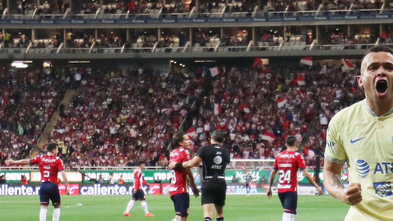 Jonathan Rodríguez celebra un gol contra Chivas en el juego más reciente entre azulcremas y rojiblancos. Crédito: Getty Images