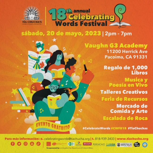 Para obtener información sobre la programación del evento, los vendedores, la entrada y los detalles del estacionamiento, visita el sitio web del Festival Celebrating Words en https://www.tiachucha.org/celebrating_words_festival.