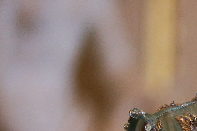 Vestido de la Coronación de la Reina Isabel II, diseñado por Sir Norman Hartnell y bordado con un esquema iconográfico de emblemas que representan a los estados de la Commonwealth y el Reino Unido y la Túnica de Estado, usado por Su Majestad en su Coronación, hecha de seda y terciopelo púrpura, y que mide 6,5 m de largo. Crédito: Nicky J Sims | Getty Images