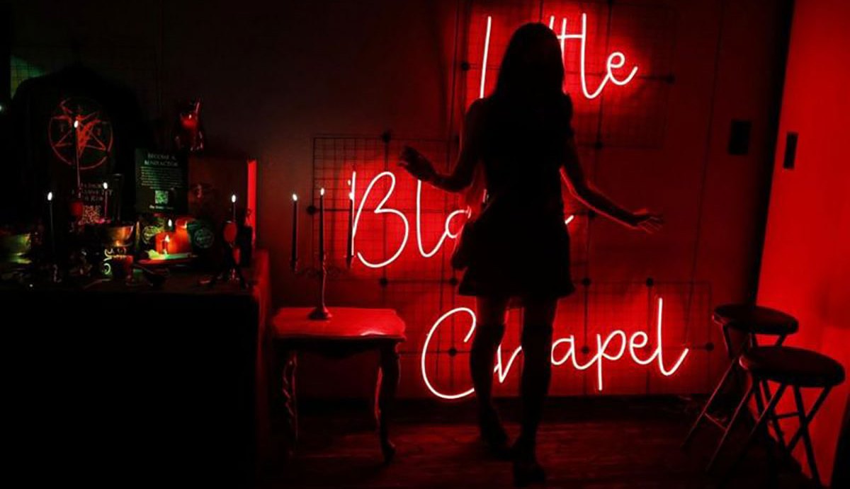 En una sala iluminada con velas reservada para ceremonias satánicas, un letrero de neón te da la bienvenida a The Little Black Chapel (La pequeña capilla negra). En un extremo de la habitación hay un altar elevado y en el suelo, frente a este, un pentagrama blanco.