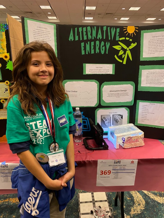 Estudiante de sexto grado Vivian Núñez, que asiste a MSA 8-Bell, presentó proyectos en tres áreas de STEAM con enfoque en el arte, la ciencia y la ingeniería. Núñez, quien actualmente es presidente del cuerpo estudiantil, le interesa una carrera en la ciencia o la contabilidad.