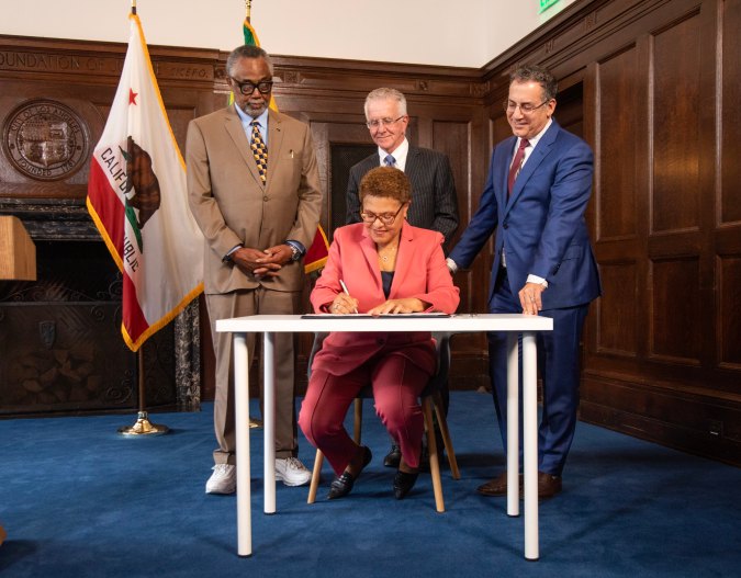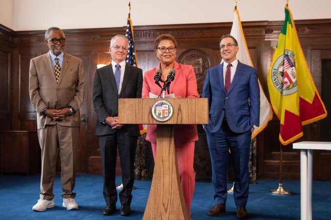 La alcaldesa de Los Angeles, Karen Bass junto a los concejales Curren Price, Paul Krekorian y Bob Blumenfield. (Cortesía) Crédito: Cortesía