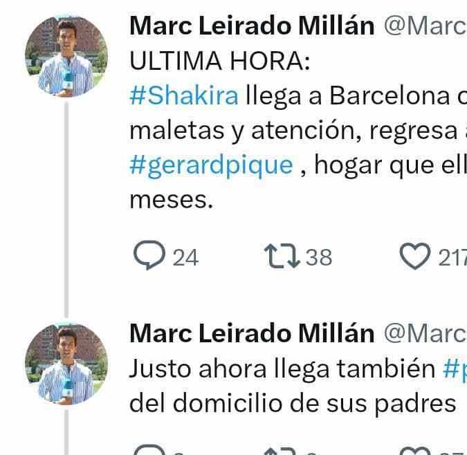 “Shakira llega a Barcelona cargada con unas 20 maletas y atención, regresa a la actual casa de Gerard Piqué, hogar que ella dejó hace dos meses”, informó en Twitter.