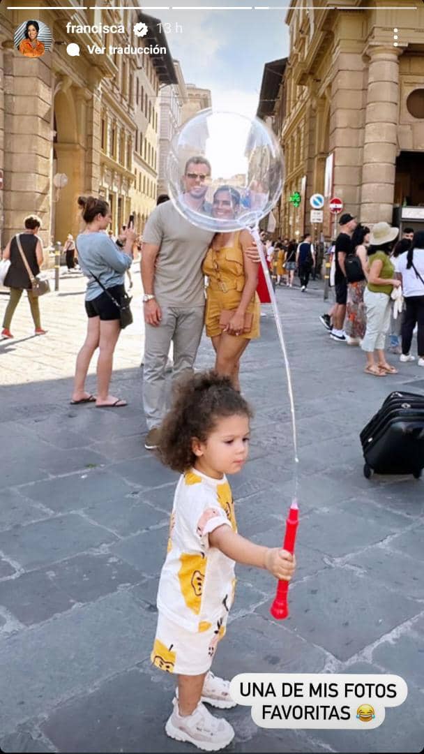 Francisca también compartió una foto que le parece muy especial del viaje. En la imagen se les aprecia a ella y a su esposo posando en la calle mientras ‘Baby Gennaro’, de casi 2 años, se encuentra parado más adelante y de perfil con un globo transparente en la mano que permite mirar la cara de sus padres a través de este.