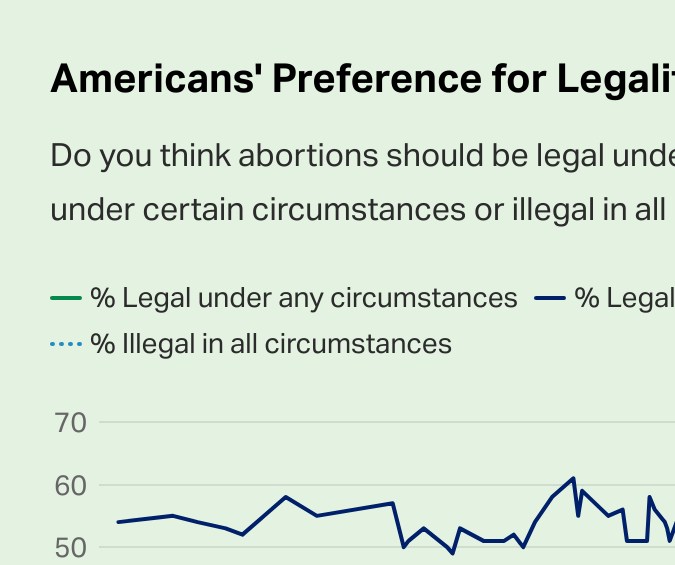 Mientras tanto, solo el 8% de los republicanos dice que el procedimiento debería ser legal en todas las circunstancias, una cifra que ha estado en un trayectoria descendente a largo plazo.