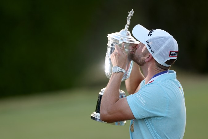 Wyndham Clark besando el trofeo del U.S. Open Championship en Los Angeles Country Club. Foto: Sean M. Haffey/ Getty Images.