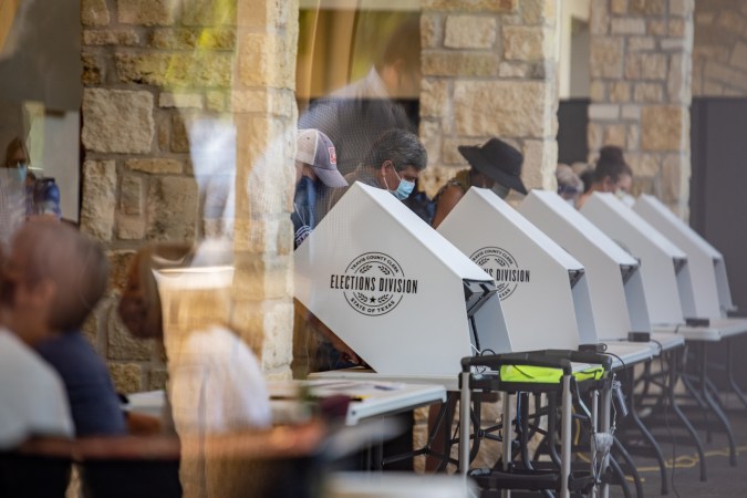 Un trabajador electoral habla con votantes el día de las elecciones de 2020 en Austin, Texas. Crédito: SERGIO FLORES | AFP / Getty Images
