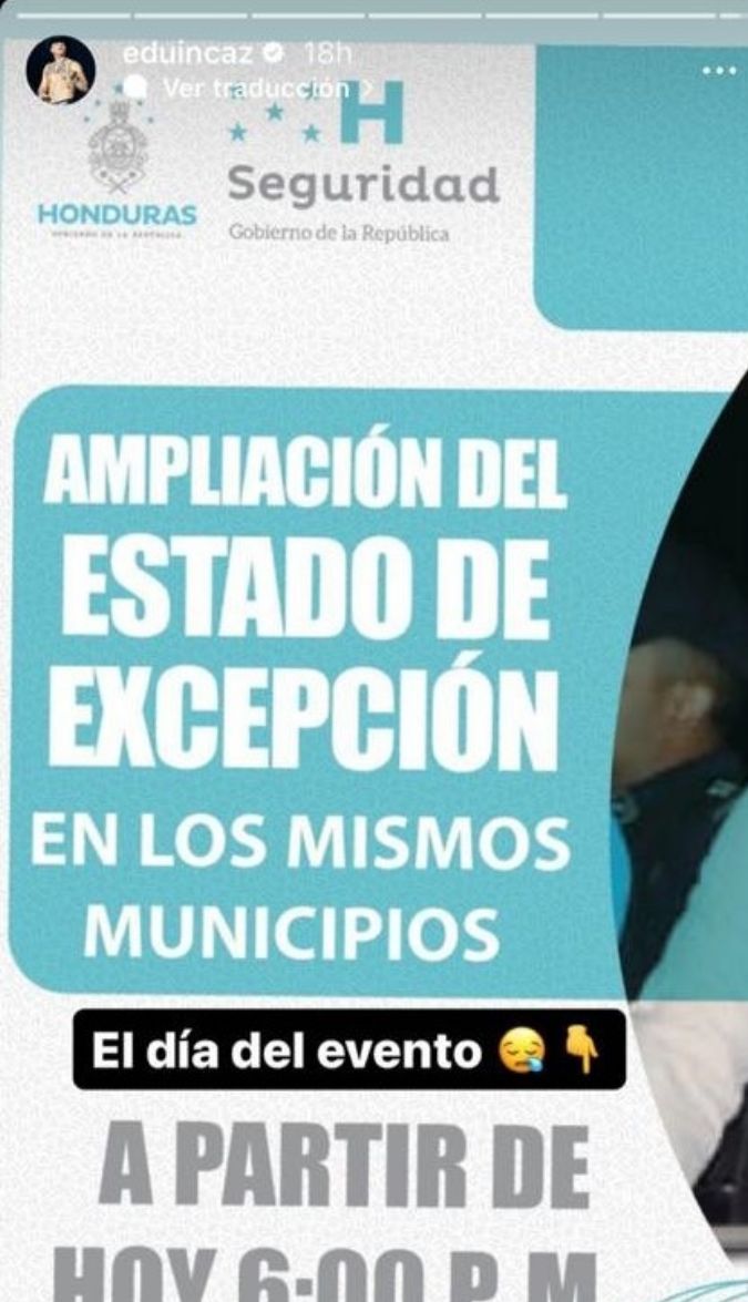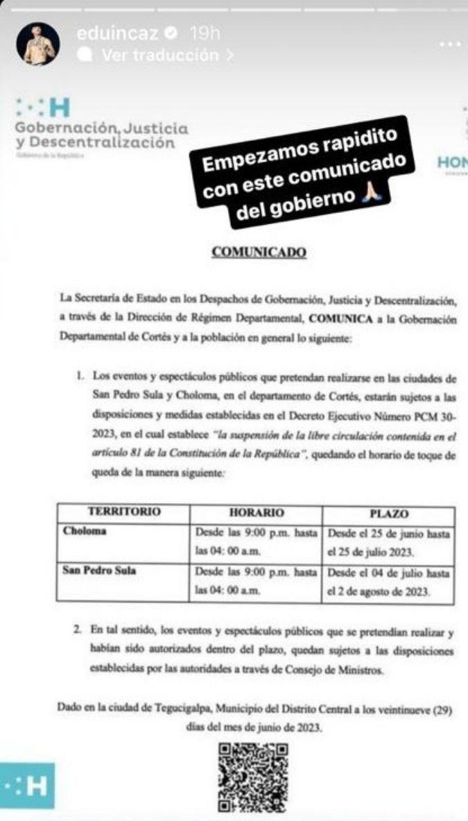 Por medio de sus historias de Instagram, el cantante de “El Tóxico” publicó el recién comunicado que dio a conocer el gobierno de la ciudad de San Pedro Sula, en donde anuncian que la gente tiene prohibido estar fuera de sus hogares, justo a la hora que se tenía pactado dicho evento.