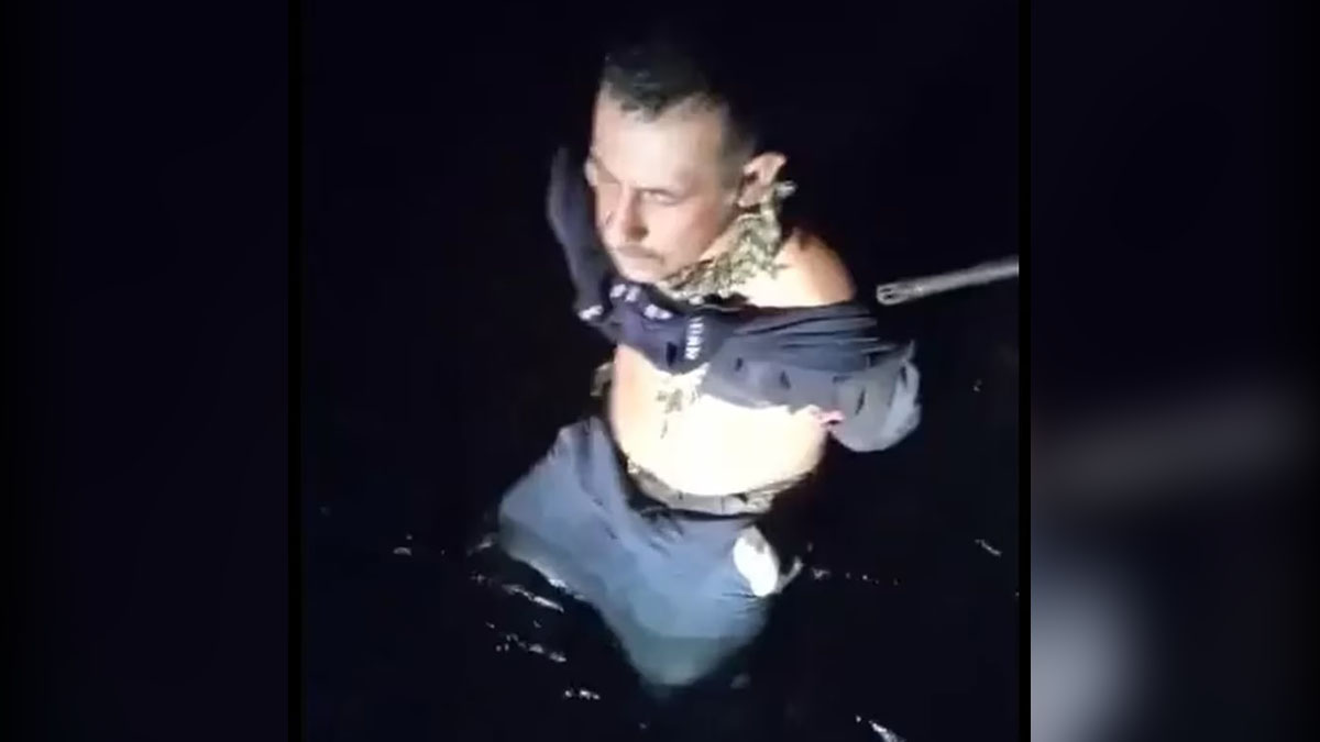 En la grabación se ve a un hombre hincado en el cauce de un río mientras es interrogado. Crédito: Twitter/@All_Source_News | Cortesía