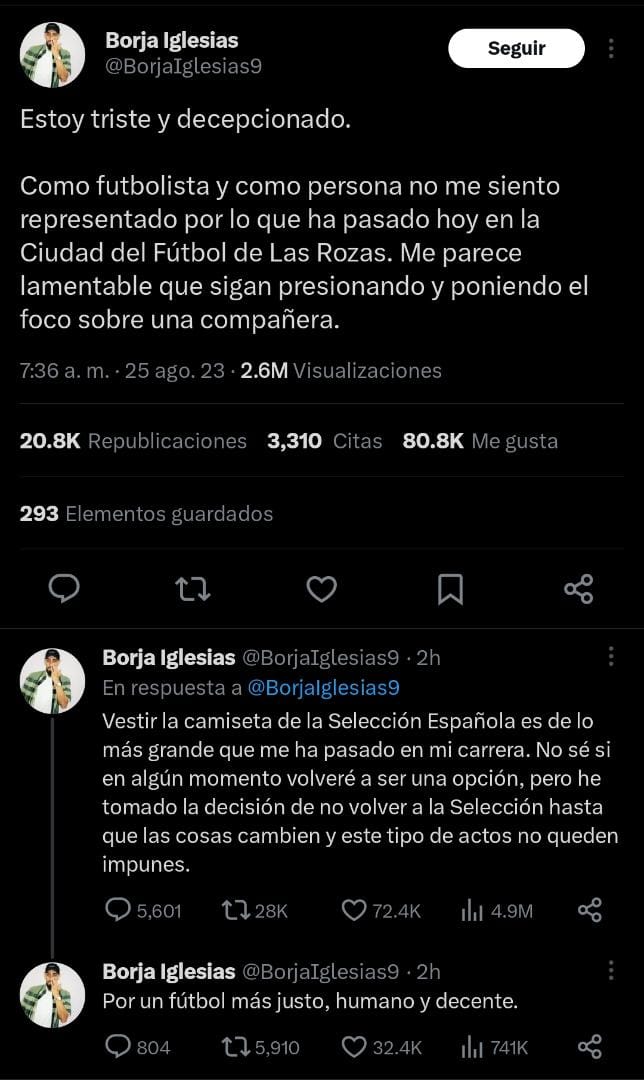 Por medio de un comunicado improvisado en varios tuits a través de su perfil en X (anteriormente Twitter), Iglesias no ocultó su indignación y condicionó su salida a un cambio verdadero dentro de la Federación. “Estoy triste y decepcionado. Como futbolista y como persona no me siento representado por lo que ha pasado hoy en la Ciudad del Fútbol de Las Rozas. Me parece lamentable que sigan presionando y poniendo el foco sobre una compañera”.