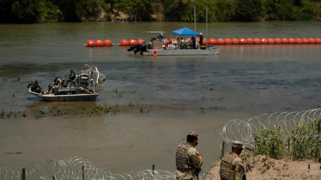 Guardias fronterizos a orillas del Río Bravo, bloqueado por la mitad con una barrera de boyas naranja instaladas por autoridades de Texas. Crédito: Eric Gay/AP/picture-alliance | Deutsche Welle